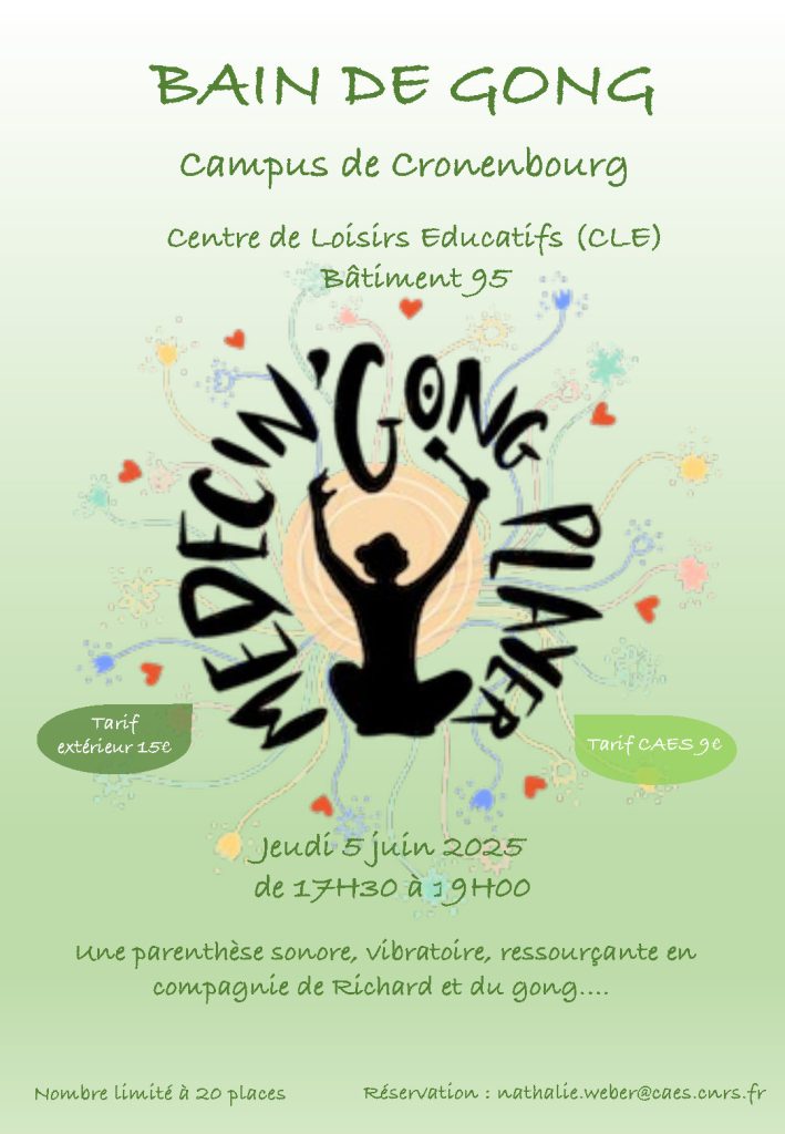 Le CAES Clas de Cronenbourg vous propose un nouveau « Bain de Gong », jeudi 5 juin 2025 de 17h30 à 19h00, bâtiment 95 du Campus de Cronenbourg.